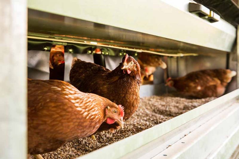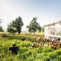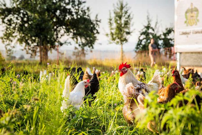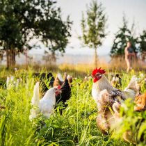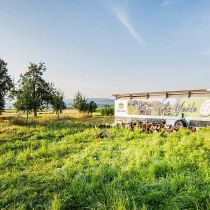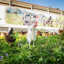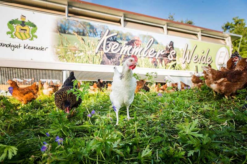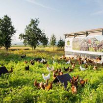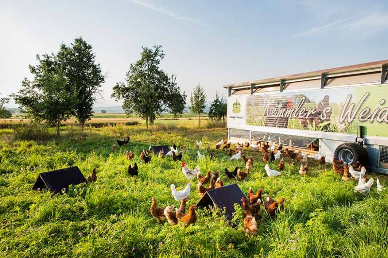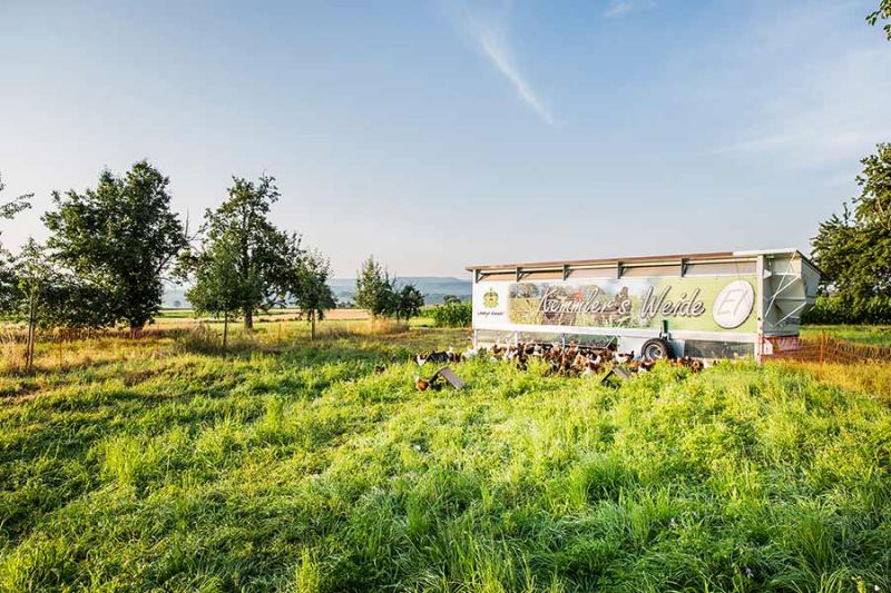 Auf einer Fläche von einem Hektar wird die mobile Stallung im regelmäßigen Rhythmus versetzt. So haben die Hühner immer genügend frisches Gras zum Fressen und die Keimbelastung wird niedrig gehalten. Täglich steht unseren Hühnern eine Freifläche von ungefähr 2.500 Quadratmetern zum freien Auslauf zur Verfügung – das entspricht im Schnitt 7 Quadratmeter pro Henne.
